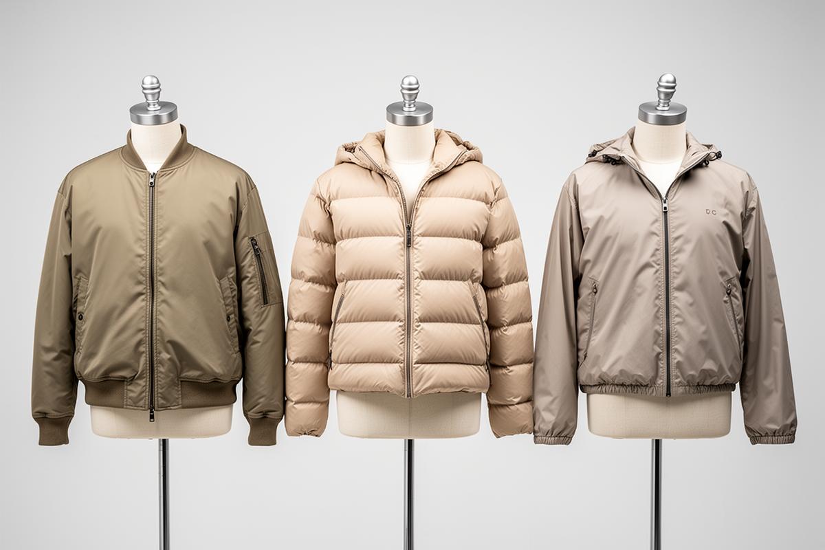 Shell fabrics for puffers include nylon ripstop, polyester micro-fiber, recycled nylon, and woven down-proof cotton. We offer both glossy and matte finishes, with DWR (Durable Water Repellent) coating standard on all outerwear shells. Packable designs with included stuff sacks, reversible constructions, and detachable hood options are all within our capability set.