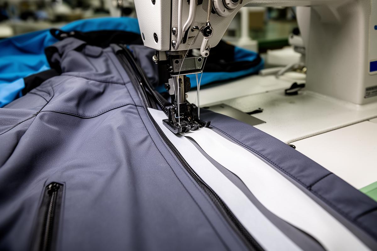 Technical outerwear construction — seam sealing and zipper installation at our facility